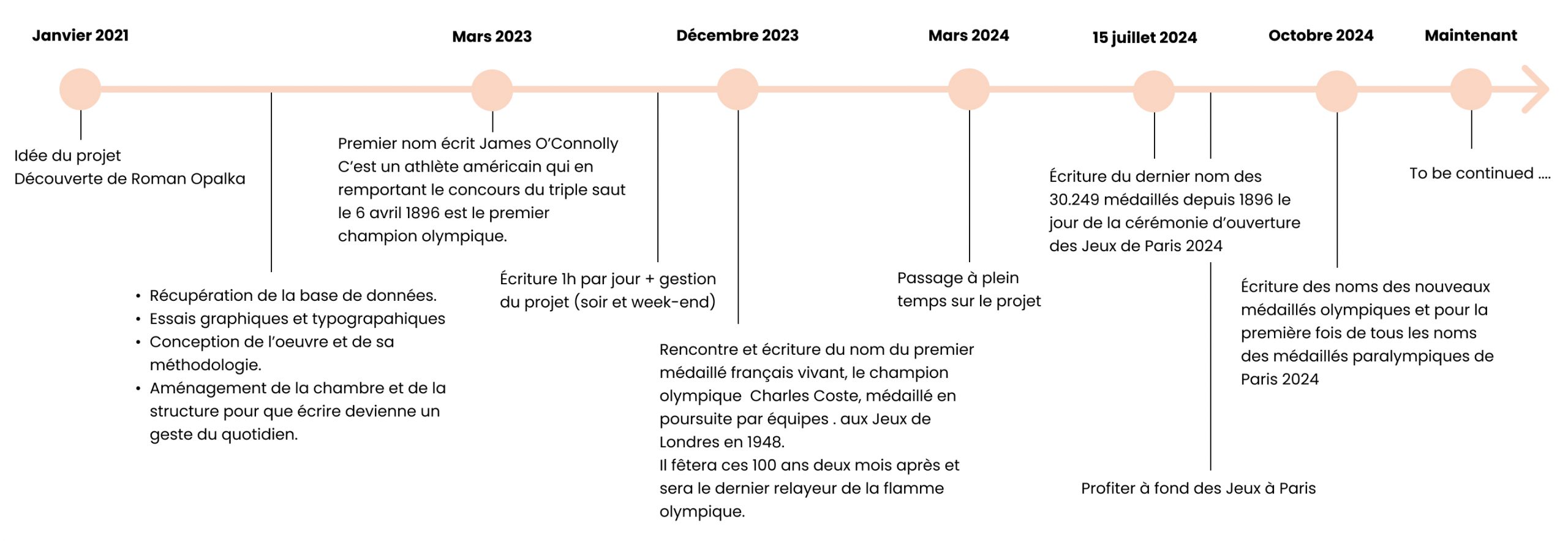 Il commencera à écrire le premier nom en mars 2023 et s’est alors appliqué (presque) tous les jours à l’écriture de ces noms. Il écrira le 30.249ème nom le vendredi 15 juillet, jour de la cérémonie d’ouverture de Paris 2024 puis écrira les noms des nouveaux médaillés olympiques de Paris 2024 et pour la première fois, celui de tous les médaillés paralympiques de Paris 2024.